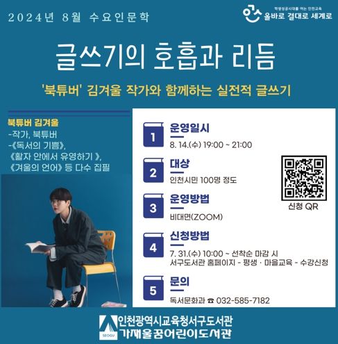 (아름다운교육신문) 인천광역시교육청서구도서관은 ‘수요인문학’ 8월 프로그램으로 북튜버 김겨울 작가와 함께하는 ‘글쓰기의 호흡과 리듬’ 강연을 8월 14일 오후 7시 온라인(ZOOM)으로 개최한다.