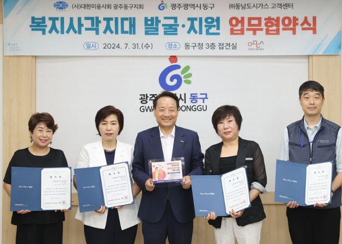 (아름다운교육신문) 광주 동구는 31일 복지위기가구 조기 발굴과 지역사회 안전망 강화를 위해 (사)대한미용사회 광주동구지회 및 ㈜동남도시가스 고객센터와 ‘복지사각지대 발굴·지원’을 위한 업무 협약을 체결했다고 밝혔다.