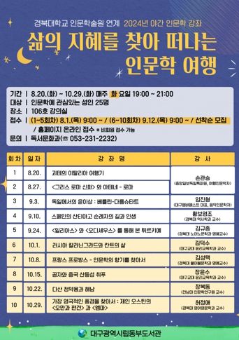 ‘경북대학교 인문학술원 연계 인문학 특강’ 《삶의 지혜를 찾아 떠나는 인문학 여행》은 8월 20일(화)부터 10월 29일(화)까지 매주 화요일 저녁 7시에 총 10회차로 운영한다.