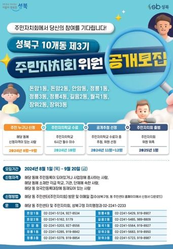 이번 공개모집은 2024년 12월 31일자로 임기가 만료되는 10개 동(▲돈암1동 ▲돈암2동 ▲안암동 ▲정릉1동 ▲정릉3동 ▲정릉4동 ▲길음2동 ▲월곡1동 ▲장위2동 ▲장위3동) 주민자치회의 신규 구성을 위해 진행한다. 또한 결원이 있는 주민자치회에서도 추가 위원을 모집해 주민자치회 활동을 더욱 강화해 나갈 계획이다.