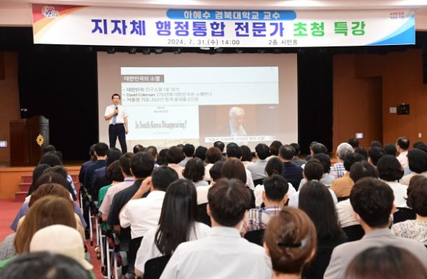 ‘미래 환경변화와 지방 행정체제개편, 지방 중소도시의 대응’이란 주제로 진행된 강의에서 하 교수는 “인구감소와 지역소멸, 수도권 집중화, 신사업의 대도시 쏠림, 교통과 통신의 발달 등 급변하는 환경 속에서 지방 중소도시가 살아남기 위해서는 지자체 통합이 최선의 대안”이라고 강조했다.