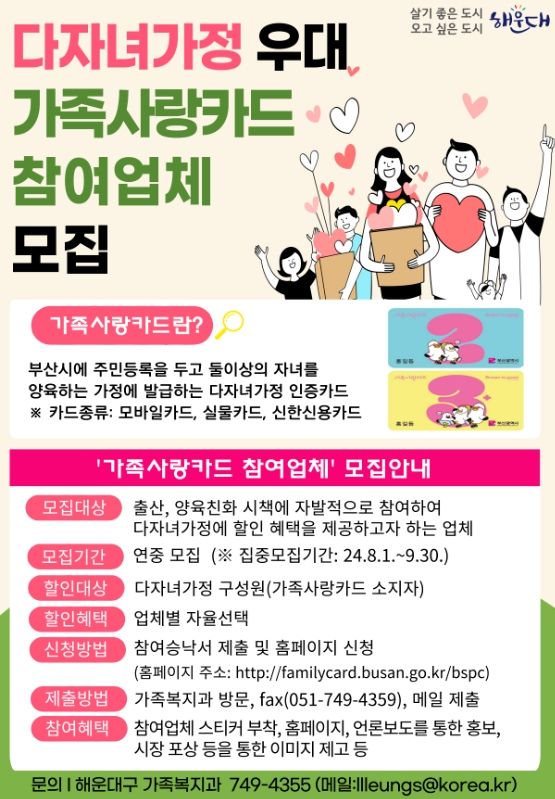 (아름다운교육신문) 해운대구(구청장 김성수)는 다자녀가정의 양육 부담을 줄이기 위해 ‘다자녀가정 우대 가족사랑카드 참여업체’를 모집한다. 모집 기간은 9월까지이다.