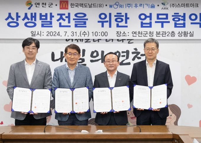 (아름다운교육신문) 연천군은 지난달 31일 군청 본관 2층 상황실에서 한국맥도날드(유), ㈜우리기술, ㈜스마트아크와 농산물 유통 활성화 등 상생 발전을 위한 업무협약을 체결했다고 밝혔다.