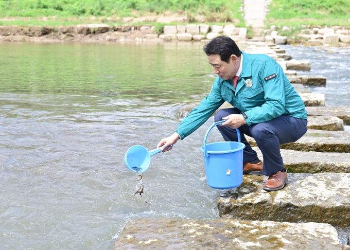 이날 (사)국가유공자환경운동본부 포천시직할회는 수질을 개선하고 생태계를 복원하기 위해 약 5만마리의 미꾸라지 60kg을 방류했다.