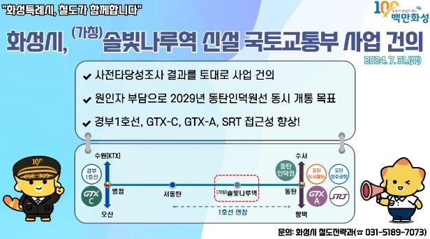 시는 이러한 시민 요구와 더불어 1호선 연장(서동탄~동탄) 확정, GTX-A 노선 개통, 3기 신도시 계획 발표 등 최근 주변 여건이 변화함에 따라 지난해부터 (가칭)솔빛나루역 신설을 위한 사전 타당성 조사를 실시했으며 이러한 결과를 토대로 국토부에 사업을 건의했다.