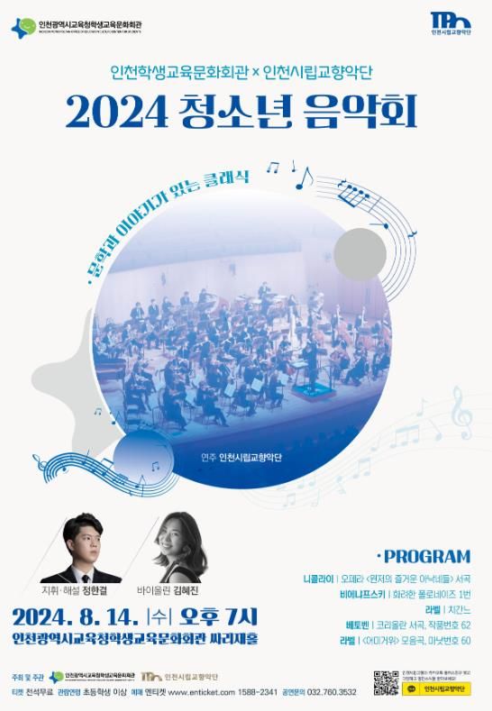 (아름다운교육신문) 인천광역시교육청학생교육문화회관은 8월 14일 오후 7시 2층 싸리재홀에서 70분간 ‘2024 청소년 음악회’를 개최한다.