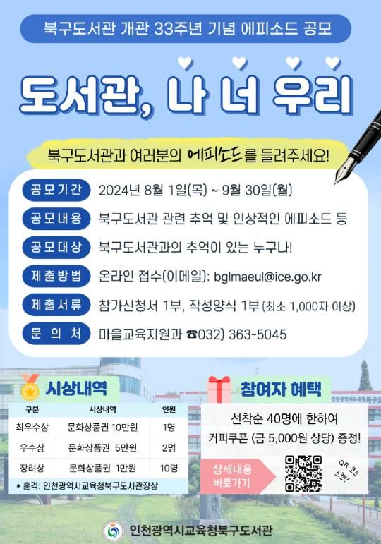 (아름다운교육신문) 인천광역시교육청북구도서관은 개관 33주년을 맞아 ‘도서관, 나 너 우리’ 에피소드를 8월 1일부터 공모한다.