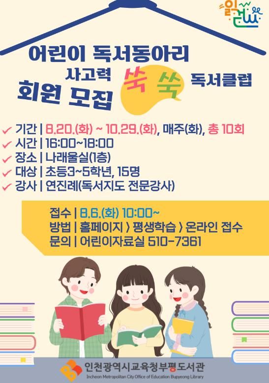 (아름다운교육신문) 인천광역시교육청부평도서관은 인천시교육청 역점사업인 읽걷쓰 문화 확산을 위해 8월 20일부터 10월 29일까지 ‘2024년 하반기 어린이 독서동아리 '사고력 쑥쑥 독서클럽'’을 운영한다.