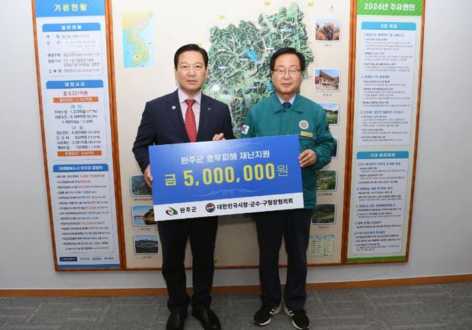 조재구 시장‧군수‧구청장협의회장은 “최근 집중호우로 피해를 입은 수해민들이 하루빨리 일상으로 돌아가기를 바라는 마음에서 성금을 기부하게 됐다”며 “수해를 입은 완주군 주민들에게 깊은 위로를 드리며 빠른 복구에 도움이 되길 바란다”고 전했다.