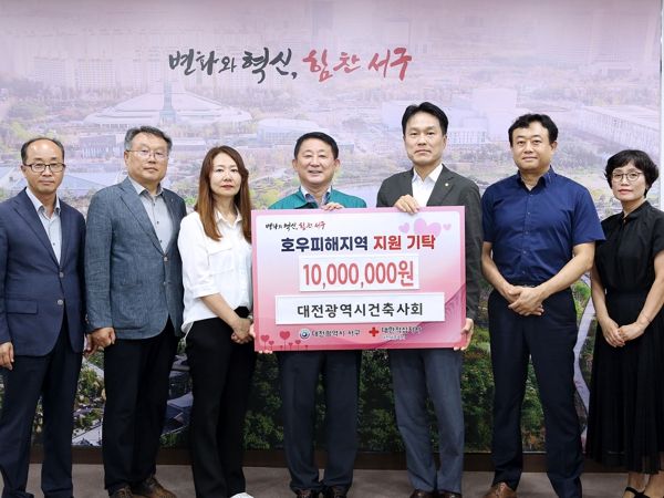 (아름다운교육신문) 대전 서구는 지난 31일 구청 갑천누리실에서 대전광역시건축사회와 관내 호우피해 지역 구호 성금(1,000만 원) 기탁식을 가졌다.