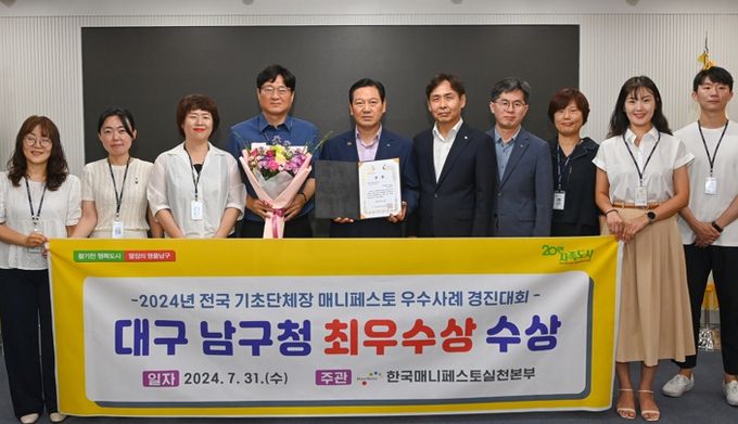 (아름다운교육신문) 대구 남구는 한국매니페스토실천본부가 주최하는 '2024 전국 기초단체장 매니페스토 우수사례 경진대회'에서 대구 기초자치단체로는 유일하게 최우수상을 수상하는 영예를 안았다.