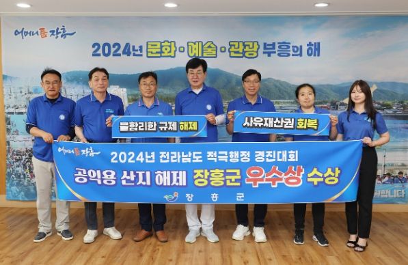 한편 2024년 전라남도 적극행정 경진대회에서 22개시군 및 전라남도 공공기관이 참가한 가운데 ‘장흥군 공익용 산지 해제’ 안건이 기관표창 우수상을 수상했다.