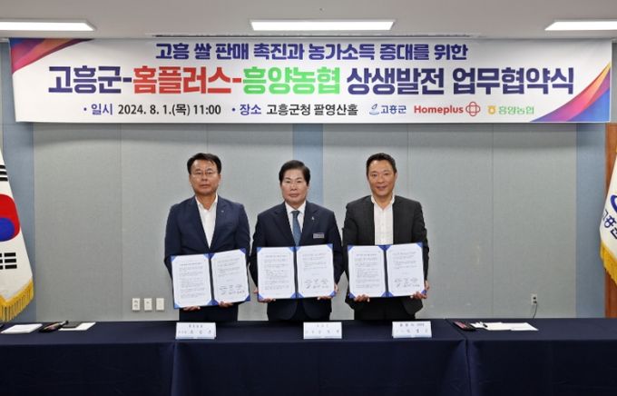 (아름다운교육신문) 고흥군공영민)은 1일 군청 팔영산홀에서 국내 최고 유통업체인 홈플러스와 흥양농협이 함께 고흥 쌀 판매 촉진과 농가 소득증대를 위한 3자 업무협약을 체결했다고 밝혔다.