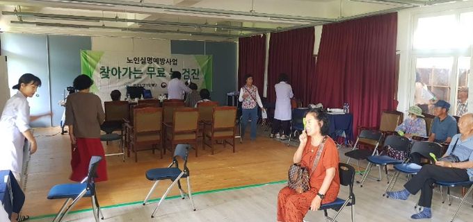 검진 당일 한국실명예방재단 소속 검진팀 7명(안과전문의 1명, 검진 진행요원 6명)이 방문하여 시력검사, 굴절검사, 안압검사, 세극등 검사 등 안과검진과 질환상담을 실시했다.
