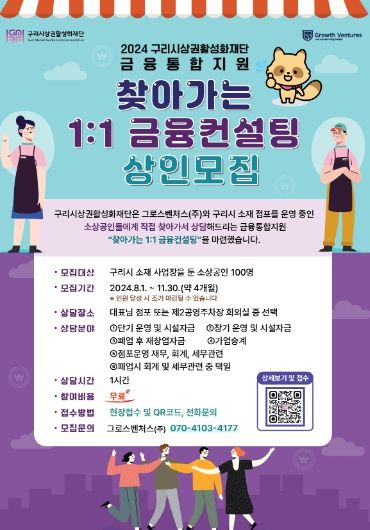 (아름다운교육신문) 구리시상권활성화재단은 8월 1일부터 11월 30일까지 급변하는 금융환경에 적응하기 어려운 소상공인을 대상으로, 전문가 진단 및 맞춤형 컨설팅을 지원하는 2024 금융통합지원 ‘찾아가는 1:1 금융컨설팅’ 사업을 운영한다.