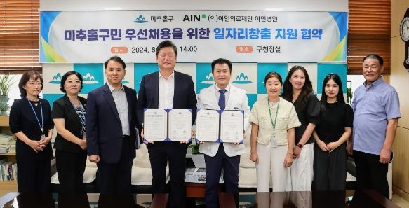 (아름다운교육신문) 인천 미추홀구는 1일 구청장실에서 의료법인 아인의료재단 아인병원(이사장 오익환)과 ‘미추홀구민 우선채용을 위한 일자리 창출 지원 협약’을 체결했다.