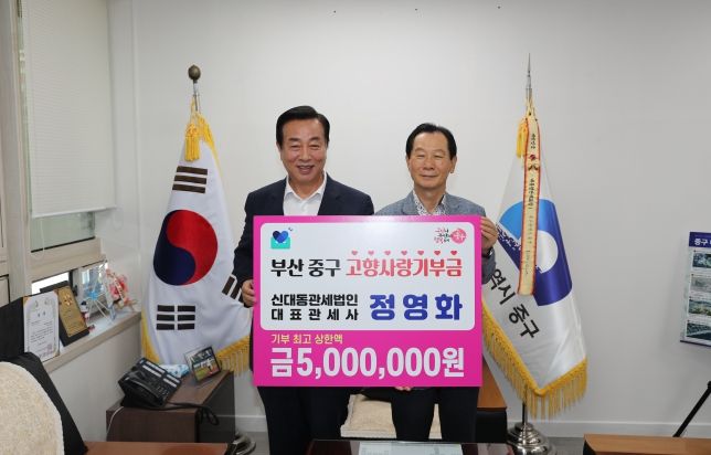 (아름다운교육신문) 부산 중구는 지난 1일 구청장실에서 정영화 신대동관세법인 대표관세사와 고향사랑기부금 전달식을 가졌다.