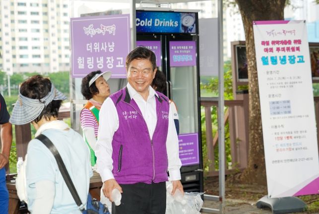 이 구청장은 자원봉사자를 도와 시원한 생수를 나눠주며 주민들과 소통했다.