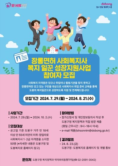 오언석 도봉구청장은 “사회복지사 전문 자격증을 보유하고도 활용하지 못했던 구민들이 본 사업을 통해 본인의 역량을 십분 발휘할 수 있길 바란다. 앞으로도 구민의 사회 진출을 돕기 위한 다양한 프로그램을 지속적으로 마련해 나가겠다”고 말했다.