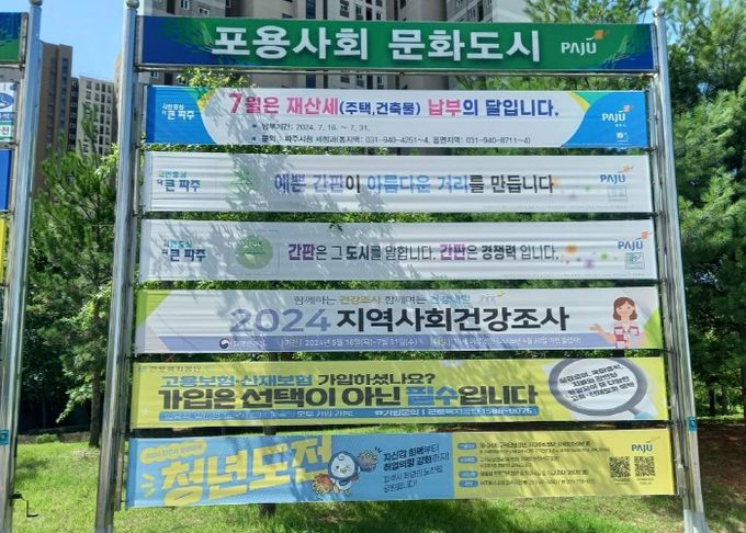 (아름다운교육신문) 파주시가 오는 9월부터 금촌과 운정신도시 중심 상권의 현수막 게시대 2기, 12면을 친환경 현수막 전용 게시대로 지정해 운영에 나선다. 친환경현수막 게첨 신청 접수는 8월 10일부터 시작된다.
