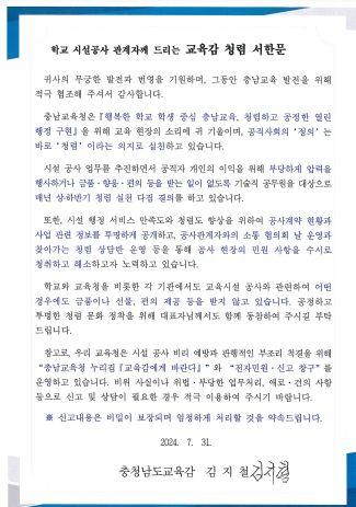 청렴 서한문에는『행복한 학교 학생 중심 충남교육, 청렴하고 공정한 열린 행정』을 구현하기 위한 충남교육청의 의지 표명과 어떠한 경우라도 금품이나 선물, 편의 제공 등을 받지 않는다는 점을 강조하면서, 부조리 척결을 위해 비위 사실, 위법․부당한 업무처리에 대해 신고 체계를 운영하고 있음을 안내했다.