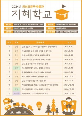 올해 처음 시행되는 『2024년 박물관 지혜학교』는 역사, 문화, 예술 등 다양한 분야를 아우르는 대학교 교양 수준의 한국사 강의로 8월 6일부터 10월 29일까지 매주 화요일 오후 2시에 의성조문국박물관 세미나실에서 진행될 예정이다.