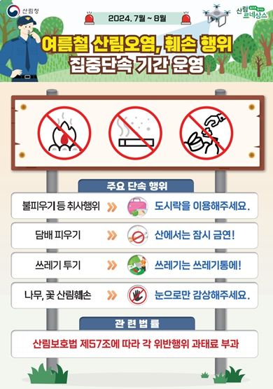 주요 단속 대상으로 산림 내 불법 시설물 설치, 무단 점유, 쓰레기 투기, 취사, 수목 굴취 등이 있으며, 훼손 행위가 적발될 경우 산림 관련법에 따라 과태료 부과 및 형사처벌의 대상이 될 수 있다.