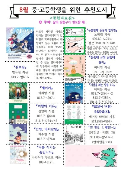 이종수 교육도서관장은 “사서추천 도서는 어떤 책을 읽어야 할지 잘 모를 때 참고해 재미있고 유익한 독서 시간을 갖게 하는 게 목적이다.”라며, “무더위가 기승을 부리는 8월에 교육도서관에서 추천도서와 함께 시원한 여름을 보내길 바란다.”고 말했다.