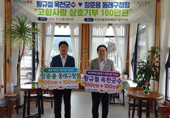 황규철 옥천군수는 이달 3일 동래구에 고향사랑기부금 1백만원을 쾌척했다. 지난 5월 장준용 동래구청장이 먼저 옥천군에 기부한 것에 대한 보답이다.