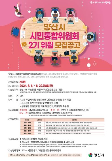 (아름다운교육신문) 양산시는 시민통합위원회 1기위원 임기 만료가 도래함에 따라 2기 위원 60명을 8월 5일부터 8월 22일까지 18일간 공개 모집한다고 밝혔다.