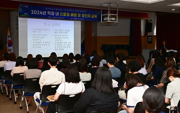 (아름다운교육신문) 대구 동구청은 지난 5일, 구청 대회의실에서 범죄 심리학 전문가인 이수정 교수를 초청해 소속 직원을 대상으로 ‘직장 내 스토킹 예방 및 성인지 교육’을 실시했다.
