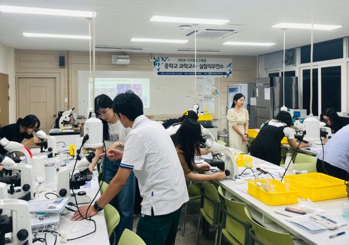 (아름다운교육신문) 제주도교육청 제주융합과학연구원은 8월 1일부터 2일까지, 2일간 도내 중학교 과학교사를 대상으로 남녕고등학교 과학실에서 '2024 디지털도구활용 중학교 과학교사대상 실험직무연수'를 운영했다.