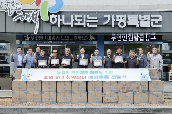 2일 서태원 가평군수를 비롯해 가평군 농업인단체협의회장과 읍면별 회장단들이 가평군청에서 얼음조끼 등 온열질환 예방물품 전달식을 하고 있다.