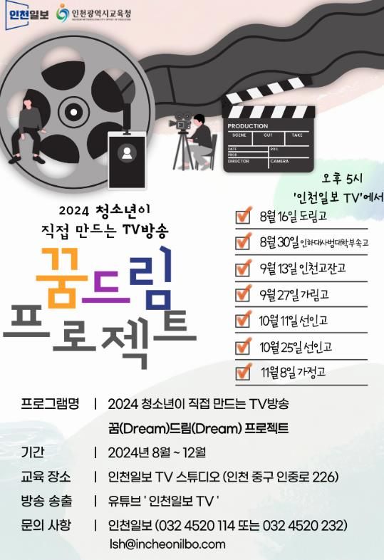(아름다운교육신문) 인천광역시교육청은 인천 관내 고등학교 학생들이 직접 뉴스를 제작하고 방송하는 ‘2024 청소년이 직접 만드는 TV 방송-꿈드림 프로젝트’를 운영한다.