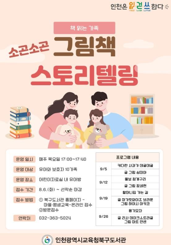 (아름다운교육신문) 인천광역시교육청북구도서관은 인천시교육청 ‘읽걷쓰’ 사업의 일환으로 유아와 부모가 참여하는 ‘책 읽는 가족’을 위한 그림책 스토리텔링을 운영한다.