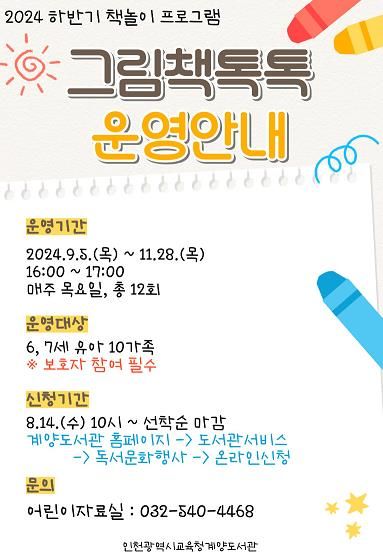 계양도서관 관계자는 “이번 ‘그림책 톡톡’ 프로그램을 통해 그림책을 활용한 다양한 독서 놀이와 창작 활동으로 어린이들의 감수성과 창의력을 키우는 데 도움이 되길 기대한다”며 “유아 가족의 적극적인 관심과 참여를 부탁드린다”고 말했다.