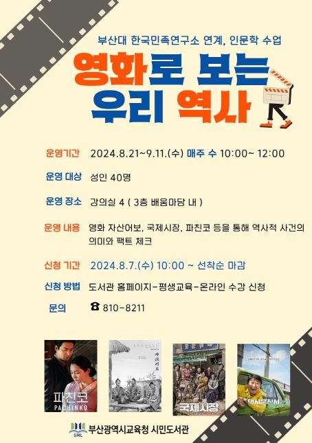 (아름다운교육신문) 부산광역시립시민도서관은 8월 21일부터 9월 11일까지 매주 수요일 오전 10시 시민도서관에서 성인 40명을 대상으로 ‘영화로 보는 우리 역사’를 운영한다.