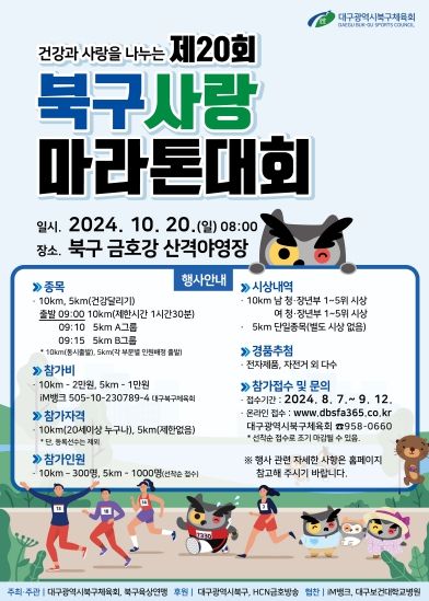 (아름다운교육신문) 제20회 북구사랑 마라톤대회가 오는 10월 20일 금호강 산격야영장 일원에서 개최되며, 참가 신청은 8월 7일부터 9월 12일까지 선착순으로 접수한다.