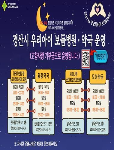 경산시는 아이를 낳고 지역 내에서 충분한 진료를 받을 수 있도록 ‘지역완결형 소아청소년 진료체계’를 구축하기 위해서 지난해 12월 『경산시 공공 야간·휴일 의료기관 및 약국 지원조례』를 제정·공포 했다.