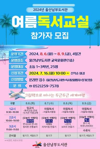 (아름다운교육신문) 울산남부도서관은 6일부터 9일까지 4일간 도서관 교육문화관에서 초등학생 1학년부터 3학년 25명을 대상으로 ‘여름 독서교실’을 운영한다.
