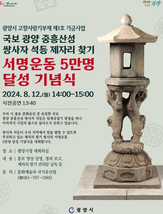 (아름다운교육신문) 광양시는 '광양시 고향사랑기부제 제1호 기금사업'으로 선정된 ‘국보 광양 중흥산성 쌍사자 석등 제자리 찾기 사업’의 범시민 서명운동 5만 명 달성을 기념해 시민들과 함께하는 기념식을 오는 12일 14시 시청 대회의실에서 개최한다고 밝혔다.
