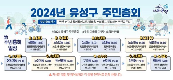 주민총회 일정은 ▲8월 8일 관평동 ▲8월 9일 노은2동 ▲8월 13일 진잠동, 상대동▲8월 14일 노은1동, 온천1동 ▲9월 2일 온천2동 ▲9월 3일 노은3동, 원신흥동 ▲9월 4일 구즉동, 신성동 ▲9월 5일 전민동 ▲9월 6일 학하동 순으로 개최하며, 자세한 일정 및 참여방법은 각 동 행정복지센터로 문의하거나 홈페이지에서 확인하면 된다.