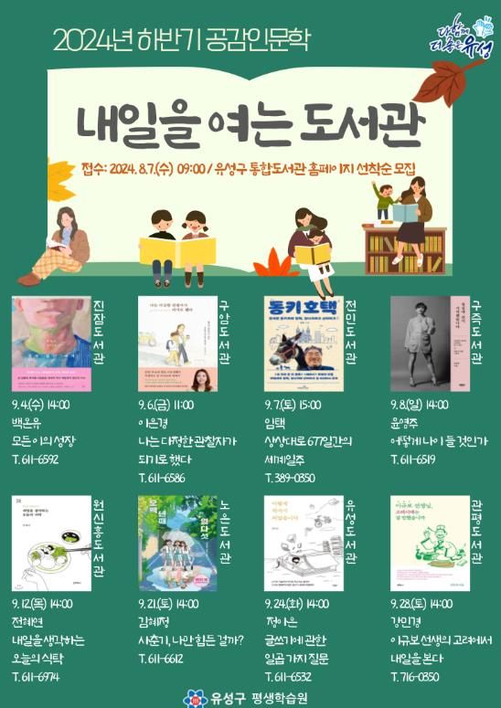 참여를 원하는 주민은 8월 7일부터 유성구 통합도서관 홈페이지를 통해 신청할 수 있으며, 자세한 사항은 유성구 공공도서관으로 문의하면 된다.
