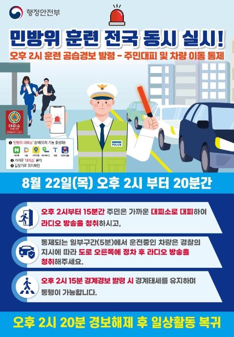 (아름다운교육신문) 행정안전부는 적 공습 시 국민의 대응 역량을 강화하기 위해 오는 8월 22일 오후 2시부터 20분간 민방위 훈련을 전국 동시에 실시한다고 밝혔다.