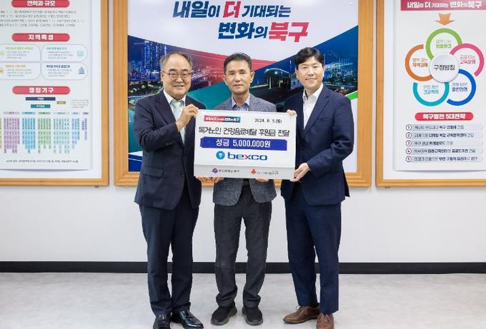 (아름다운교육신문) ㈜벡스코는 지난 5일, 부산 북구청을 방문하여 ‘독거노인 사랑의 건강음료 배달사업’에 사용해 달라며 후원금 500만원을 전달했다.