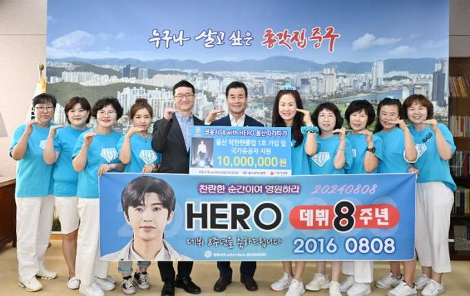 (아름다운교육신문) 임영웅 팬클럽 영웅시대 With Hero 울산 따라따라가 가수 임영웅 첫 등장(데뷔) 8주년 및 광복절 79주년을 기념해 8월 7일 오전 10시 중구청 구청장실을 찾아 이웃돕기 성금 1,000만 원을 전달했다.