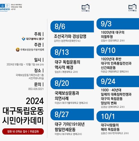 대구 중구가 주최하고 (사)국채보상운동기념사업회가 주관하는 대구독립운동 시민아카데미는 10월 1일까지 매주 화요일 오후 2시부터 4시까지 국채보상운동기념도서관 1층에 있는 시민커뮤니티실에서 8회 진행된다.