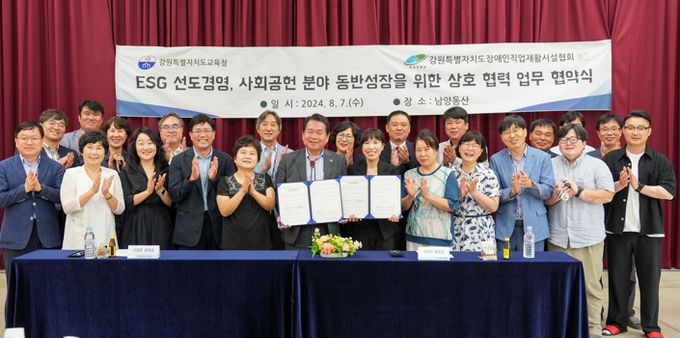 (아름다운교육신문) 강원특별자치도교육청과 강원특별자치도 장애인직업재활시설협회는 7일 오전 10시, 춘천시 신북읍 남양동산에서 ‘ESG 선도경영, 사회공헌 분야 동반성장을 위한 업무협약’을 체결했다.