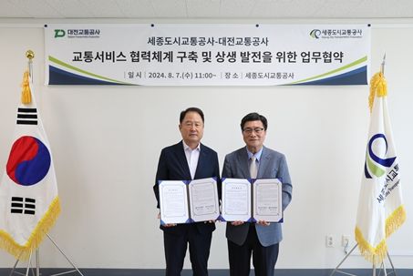 (아름다운교육신문) 세종도시교통공사와 대전교통공사가 7일 오전 첨단BRT차고지에서 교통서비스 협력체계 구축 및 지역사회 상생발전을 위한 업무협약을 체결했다.
