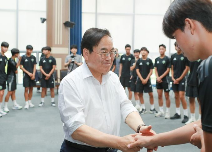 서거석 전북특별자치도교육감이 올해 전국대회 2관왕에 오른 전북현대모터스FC 유스팀 전북현대U18전주영생고등학교(교장 이장훈) 축구선수들을 격려했다.
